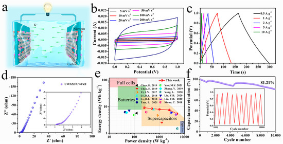 In order to further investigate the functional electrochemical performance of CWFZ2, a two-electrode SSC was directly constructed using two CWFZ2 electrodes (Figure 6a). Figure 6b shows the CV curves of the CWFZ2//CWFZ2 SSC from 5 mV s−1 to 200 mV s−1. All of the CV curves appear similar to those of the rectangles. Furthermore, the GCD curves show similar isosceles triangle shapes at various current densities, indicating good reversibility and EDLC behavior (Figure 6c). Notably, the device exhibits a capacitance of 29.86 F g−1 at a current density of 0.5 A g−1. An EIS analysis of CWFZ2//CWFZ2 was performed at 0.01 Hz to 100 kHz (Figure 6d). As shown, the Nyquist plot of this device shows a near-vertical line at low frequencies, indicating capacitive behavior [50]. The resistance of the SCs can be obtained as 1.11 Ω through the intercept of the curve and the abscissa. Furthermore, the SSC shows a high energy density of 4.15 Wh kg−1 at a specific power of 113.64 W kg−1 at a current density of 0.5 A g−1 (Figure 6e), which is higher than that of some the reported carbon-based devices [51,52,53,54,55,56,57,58,59]. At a current density of 10 A g−1, the specific power increases to 2272.73 W kg−1, and the specific energy remains at 2.46 W h kg−1. Although the power density has increased by a factor of ~20, the energy density has only dropped by 40.7%. The results show that CWFZ2 has great application potential in high-rate energy storage devices. The electrochemical cyclability with high retention (81.21%) after 10,000 cycles demonstrates the high reversibility and stable electrochemical behavior of the CWFZ2-based SC (Figure 6f).