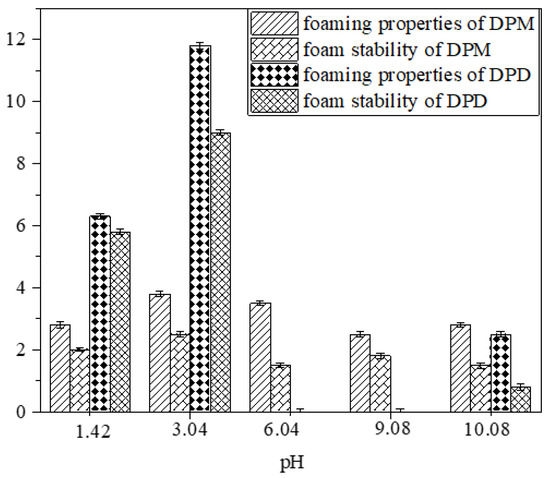The foam properties of DPM and DPD under different pH conditions are shown in Figure 6. The foaming performance and foam stability under acidic conditions are better than those under alkaline conditions. This may be because there are a large number of positive hydrogen ions under acidic conditions, which have a charge-attracting effect with the hydrophilic group phosphate negative ions in DPM and DPD. Therefore, the repulsion between the hydrophilic groups of the DPM and DPD molecules is weakened, and the foaming ability and foam stability are enhanced. Under alkaline conditions, OH− and phosphate anions have a charge-repulsion effect, which strengthens the repulsion between the hydrophilic groups of DPM and DPD molecules, and their foaming ability and foam stability are relatively weaker than in acidic conditions [25]. When pH = 3.04, DPM and DPD had the strongest foaming ability and the best foam stability. In addition, the foam performance of diesters under acidic conditions is better than that of monoesters, because the molecular arrangements of diester surfactants are more similar to those of monoester surfactants. When pH = 6.04 and 9.06, the foaming capacities of DPD and DPM are poor, because the contents of H+ and OH− in the solution are too low in the range of 6.04–9.06, and it is difficult to make DPD and DPM hydrophilic to form bubbles. As DPM has one more hydroxyl group than DPD, its hydrophilic property and foam performance are better than those of DPD. The foam heights of CTAB and SDBS reached 39 mL and 16 mL, respectively [11]. Moreover, the foaming performance of each was stable, and the foaming heights remained unchanged. By comparing the foaming properties of traditional surfactants CTAB and SDBS, it can be seen that the foaming properties of DPM and DPD are poor.