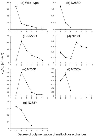 Substrate chain-length specificity of Asn258 mutants of BspAG13_31A. (a) Wild type, (b) N258D, (c) N258G, (d) N258L, (e) N258P, (f) N258W, and (g) N258Y. The kcat/Km values for a series of maltooligosaccharides are shown. The values presented are the average and standard deviation from three independent experiments. The kcat1/Km1 values of wild type, N258G, and N158P for G2 are plotted. Panel (a) was made using data from reference [9]. The kcat/Km values of N258D and N258W for G5–G7 and those of N258Y for G6 and G7 were not determined.