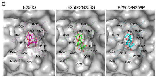 The Fo–Fc maps of E256Q/N258G and E256Q/N258P clearly revealed the existence of a substrate molecule in the substrate binding sites (Figure 5). In the analysis of the co-crystal of E256Q/N258P and G4, the electron density of only three d-glucosyl residues covering subsites from –1 to +2 was observed. The G3-bound structure of E256Q/N258P was not solved by co-crystallization with G3 (data not shown). Orientations of the d-glucosyl residues of G3 in subsites –1 and +1 were similar in E256Q/N258G, E256Q/N258P, and E256Q (PDB entry, 5ZCD) (Figure 5C,D). The conformation of the d-glucose residue in subsite +2 of the double-mutant enzymes was similar but differed from that found in E256Q. Torsion angles of d-glucosyl residues in subsites +1 and +2 of E256Q/N258G and E256Q/N258P were close to the torsion angles of d-glucosyl residues in the stable α-glucan: Φ (5-O, 1-C, 4′-O, 4′C) = 102° and Ψ (1-C, 4′O, 4′-C, 5′-C) = –120° [23] (Table 6), which is considered the global minimum energy structure [24]. In E256Q/N258G, the SD of Met229 located at the C-terminus of β→α loop 4 is suitably located to form a hydrogen bond with 3-O of the d-glucose residue in subsite +2. This hydrogen bonding interaction was not observed in the complexes of E256Q and E256Q/N258P. The orientation of the side chain of Phe282 in E256Q/N258G, E256Q/N258P, and E256Q differed, presumably because of the closely located amino acid residue at position 258 (Gly, Pro, and Asn in E256Q/N258G, E256Q/N258P, and E256Q, respectively). The side chain of Phe282 of E256Q/N258G and E256Q was suitably positioned to interact with the d-glucosyl residue at subsite +2, whereas that of Phe282 in E256Q/N258P was distal from the corresponding d-glucosyl residue and unlikely to have any contact with the substrate. In addition, the carbonyl oxygen of Phe282 was suitably positioned to form a water-mediated hydrogen bond with the d-glucose residue at subsite +2 in E256Q/N258G and E256Q but not in E256Q/N258P.