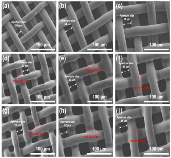 SEM images of the stainless-steel mesh (a) 26 μm, (b) 34 μm, (c) 38 μm and PFA coated stain-less-steel mesh (d) 23 μm, (e) 32 μm, (f) 36 μm and oxyfluorination treated PFA coated stainless-steel mesh (g) 23 μm, (h) 32 μm, (i) 36 μm.