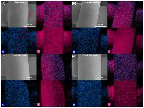 The SEM image in Figure 1 shows the changes in the surface morphology of the stainless-steel mesh before and after PFA coating and surface treatment. In the case of stainless-steel mesh, the open pore size was approximately 26, 34, and 38 μm, and the surface was smooth (see Figure 1a–c). After the application of the PFA coating, the pore size decreased to approximately 23, 32, and 36 μm due to PFA coating thicknesses of 1 to 1.5 μm. In addition, it was confirmed that the surface of the stainless-steel mesh after PFA coating was rougher than the original surface. However, it was confirmed that a uniform PFA coated layer on the surface of the stainless-steel mesh was achieved through the pore not being blocked by the spraying method (see Figure 1d–f). Particularly, there was no significant difference in the PFA coated surface of the stainless-steel mesh before and after the oxyfluorination treatment as shown in Figure 1g–i. Surface treatment with other chemicals or plasma may be accompanied by surface damage, which may affect durability. Therefore, these results showed that surface treatment through oxyfluorination is an appropriate way to modify surface properties while minimizing surface damage [35,36,37]. In addition, a corrosion test was conducted using hydrofluoric acid for 30 days to confirm whether the mesh had acid resistance by PFA coating. As a result of visually checking the degree of corrosion at the end of the experiment, corrosion of the steel mesh was not observed in both the PFA-coated mesh or the oxyfluorinated sample. Figure 2 shows distribution of oxygen and fluorine elements in stainless- steel mesh before and after PFA coating and oxyfluorinated surface treatment. It was confirmed that the PFA coated layer was well formed by the spraying method as oxygen and fluorine of the PFA coated stainless-steel mesh were uniformly distributed on all surfaces (see Figure 2a). In addition, it was confirmed that the surface element distribution of the stainless-steel mesh coated with PFA after oxyfluorination treatment was similar to the stainless-steel mesh before oxyfluorination treatment. Through this, it was confirmed that surface treatment through oxyfluorination is a method that can modify surface properties while minimizing surface damage (see Figure 2b,c). In addition, despite the increase in the oxygen gas volume ratio during oxyfluori-nation, it is similar to the untreated PFA-coated stainless-steel mesh, but the blue color of the SEM-EDS photograph of O50-PFA/mesh is observed, which clearly increases the distribution of oxygen elements (see Figure 2d).