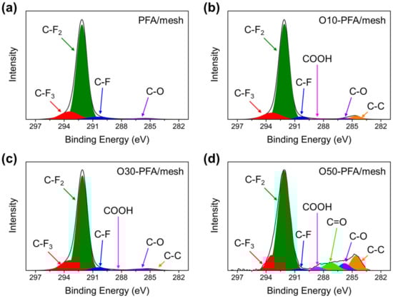 XPS spectra of stainless-steel mesh coated PFA before and after surface modification by oxyfluorination: (a) PFA/mesh, (b) O10-PFA/mesh, (c) O30-PFA/mesh, and (d) O50-PFA/mesh.