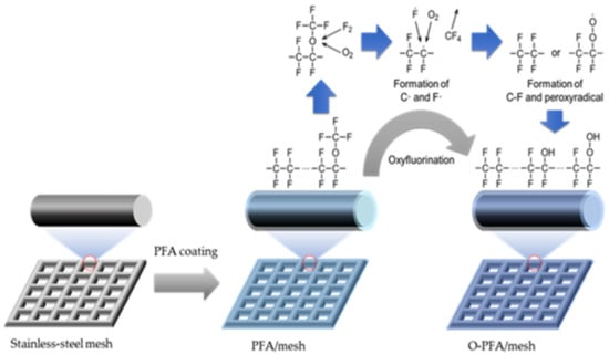 The oxyfluorination reaction of the PFA-coated stainless-steel mesh was carried out using a batch-type device equipped with a nickel reactor. The detailed oxyfluorination procedure was presented in our previous work [41,42,43,44,45]. Before oxyfluorination, the reaction chamber was evacuated three times using a pressure-reducing pump and purged by nitrogen gas to remove the residual moisture. The reactor in a vacuum state was heated to 300 °C at a rate of 10 °C/min. The mixed gases with fluorine and oxygen gas were injected into the reaction chamber at partial pressure ratios of F2:O2 = 9:1, 7:3, and 5:5 and were then maintained for 20 min. After the reaction was completed, the inside of the reactor was evacuated three times using nitrogen gas to remove the unreacted fluorine gas, and then the sample was collected. The obtained samples were denoted O10-PFA/mesh, O30-PFA/mesh, and O50-PFA/mesh according to the mixed oxygen gas fraction.