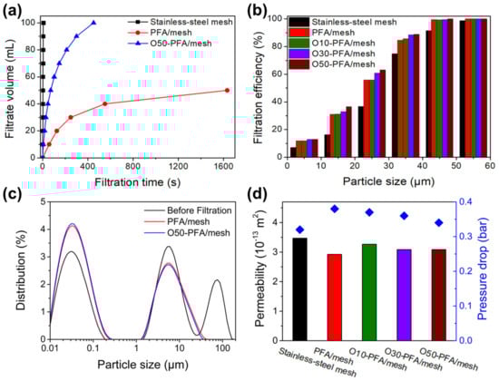 Figure 6c shows the particle size distribution before and after filtering the produced SiO2 microparticles dispersion solution with PFA coating and oxyfluorinated stainless- steel mesh. Three large peaks are observed in the dispersion solution of the unfiltered SiO2 microparticles (black). The three peaks show microparticles of less than 1 μm, 1 to 35 μm microparticles, and more than 35 μm microparticles. When the PFA-coated stainless-steel mesh is filtered through a filter, two peaks are observed and it is determined that 35 microparticles were completely filtered. It can be seen that 35 μm SiO2 microparticles were completely removed because the pores of the PFA-coated stainless-steel mesh were 32 μm. The O50-PFA/mesh sample also has two peaks after filtering the dispersion solution, which can be found to be similar to the graph with PFA/mesh. Through this, pores are greatly involved in the removal of SiO2 microparticles, but it is judged that filtration efficiency is improved due to an increase in permeability through oxyfluorination.