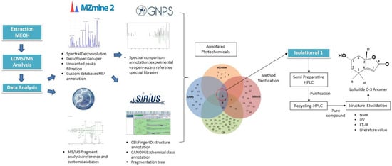 The tandem LCMS-based phytochemicals analysis of the methanolic extract of E. indica through the integration of MZmine, GNPS, Compound Discoverer and SIRIUS platforms has managed to annotate and identify a total of 65 phytochemicals, comprising primary and secondary metabolites. It was found that all of these platforms complement each other by providing a wealth of information on the characterization, annotation, and identification of phytochemicals. The reliability of the technique was verified with the isolation of one of its consistently identified phytochemicals, 1, known as loliolide. The structural elucidation of 1 using 1D and 2D NMR as well as comparison with literature values confirm that the isolated phytochemical is an anomer of loliolide at the C-3 position. This has consequently increased the level of confidence in the technique applied. The present work describes a tandem LCMS-based data analysis as a useful method for a fast and simultaneous identification of phytochemicals in E. indica, contributing to the study of the chemical properties of the genus and family. However, the elucidation of 1 as the anomer of the annotated compound also supports the limitation of MS spectra in differentiating stereoisomers. For this, additional experiments, including comparison with standards, are required to assign the absolute structure.