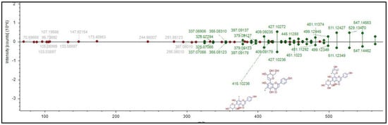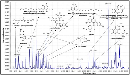 As shown in Table 1, the above processing of the extract managed to annotate 12 phytochemicals based on the custom-built database (LR and DNP sourced). Three of the phytochemicals were detected at several different retention times, namely, loliolide (1, 1′), isoschaftoside (2, 2′), and adenosine (5, 5′); they were assigned the same acronym but with the addition of prime (‘) to the duplicate to ease confusion. This redundancy in detection is probably due to the stereoisomerism of the compounds, which may affect their polarity [22]. Notably, MS spectra typically cannot differentiate the stereoisomers, and additional experiments, including comparison with standards, are required to assign the absolute structure [23]. The annotated phytochemicals, loliolide (1, 1′), isoschaftoside (2, 2′), and vitexin (3) were hit with the custom database developed through the LR, and 4-ethoxy-6-methoxy-2-(8,11,14-pentadecatrienyl)-1,3-benzenediol,5-Ethoxy-3-(10,13,16-heptadecatrienyl)-1,2,4-benzenetriol (4), oryzamutaic acid E (7), 1-feruloyl-2-hydroxyputrescine (8) and 2-[2-(3-Methoxyphenyl) ethenyl]-4H-3,1-benzoxazin-4-one, 2-(3-methoxycinnamoyl)-4H-3,1-benzoxazin-4-one (9) were detected using the enriched database from DNP. Adenosine (5, 5′) was hit by both LR and DNP sourced. Of these annotated phytochemicals, only 2 and 3 have been previously reported as the constituents of E. indica [14,20,24]. Since the LR database was only focusing on secondary metabolites, it seems that the DNP database complemented it by annotating some common compounds and primary metabolites from the plant extract. All the phytochemicals annotated in MZmine were identified with confidence level 3 due to only MS1 data characterization [25,26]. To acquire a higher level of confidence, the structures must be further characterized with their MSn using GNPS, CD and SIRIUS platforms.