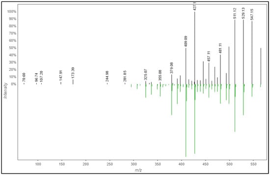 As shown in Figure 3, analysis through the GNPS platform managed to annotate 14 phytochemicals, of which three (1, 2 and 3) were also hit in the MZmine platform. The detailed features of the 14 annotated phytochemicals are listed in Table 2, which includes their library class, cosine, spectral and library m/z, ionization used, instrumentation, and ion source. With all the library hits, the mirror match between the experimental and library mass spectra can be obtained. For example, the mirror spectral match for isoschaftoside (2) shows a very close similarity (gold level) to the experimental data (Figure 4), with a cosine value of 0.82. This confirms that the m/z 565.26 peak detected in the methanolic extract can be putatively annotated as isoschaftoside. An m/z peak at 433.11 with a cosine value of 0.96 was annotated as vitexin (3) similar to that annotated in MZmine platform. This match was also classified in the GNPS platform as a gold level due to the excellent quality of a match with the experimental spectrum considering the mass accuracy of the reference spectrum (resolution and calibration of the instrument), sample type, experimental setup, and associated sample information (metadata). It is worth mentioning that annotations 2 and 3 were matched with the Bioinformatics and Molecular Design Research Center Mass Spectral Library—Natural Products (BMDMS-NP), which contains high reliability references on experimental spectral data of metabolites. In fact, BMDMS-NP reports that the reference data for the two phytochemicals were obtained from the same instrument used in the present study (orbitrap), thus further illustrating the reliability of the result. Another phytochemical that shared high reliability in the annotation is loliolide (1) of cosine value 0.94 and bronze match classification. Isoschaftoside and vitexin have been reported previously as constituents of this plant [14,20].