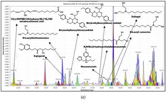 Annotated metabolites from CD based on TIC chromatogram. (a) retention time 0–6 min, (b) retention time 6–15 min, (c) retention time-13–22 min.