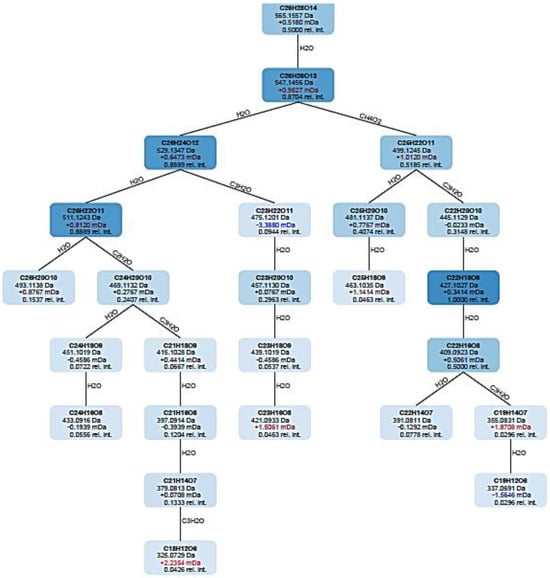 The fragmentation tree of candidate 2 with 565.16 m/z annotated as isoschaftoside.