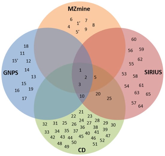 The platforms used in the present work each have their own strengths in the phytochemical annotation and identification process. The Venn diagram in Figure 8 below shows the performance of each platform in annotating the phytochemicals of E. indica. It can be clearly seen that only three phytochemicals, namely, loliolide (1), isoschaftoside (2), and vitexin (3), could be consistently identified through the four platforms. The CD platform gave the highest number of annotated phytochemicals (40) which is probably due to the large databases integrated into the platform, as mentioned earlier. As expected, the MZmine platform gave the lowest number of annotated phytochemicals (7) since it only integrates with a custom database built based on the phytochemicals previously reported from the Poaceae family. Since each platform gave a diversity of phytochemicals, it is suggested to use all of the platforms on a complementary basis, to annotate and identify different phytochemicals.