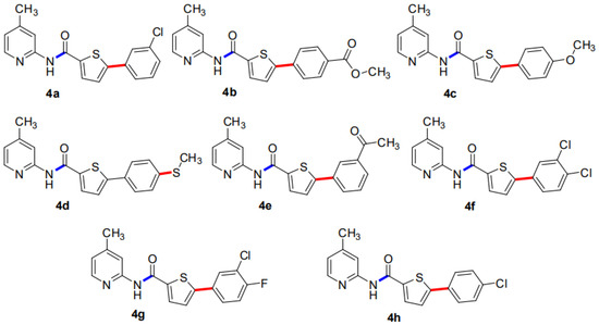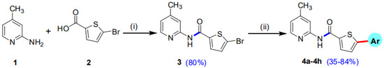 Our research group has previously reported the synthesis of 5-Bromo-N-(4-methylpyridin-2-yl)thiophene-2-carboxamide (3) in good yield (80%) by reacting 5-bromothiophene-2-carboxylic acid (1) with 2-amino-4-methylpyridine (2) in the presence of titanium tetrachloride (TiCl4) coupling reagent and pyridine which acts as solvent as well as a base. A library of 5-Bromo-N-(4-methylpyridin-2-yl)thiophene-2-carboxamides (4a–h) has been synthesized in moderate to good yields of 35–84% by the Suzuki Miyaura cross-coupling reaction of the intermediate compound (3) with various aryl boronic acids, using commercially available Palladium tetrakis catalyst (Scheme 1, Figure 1) [29].