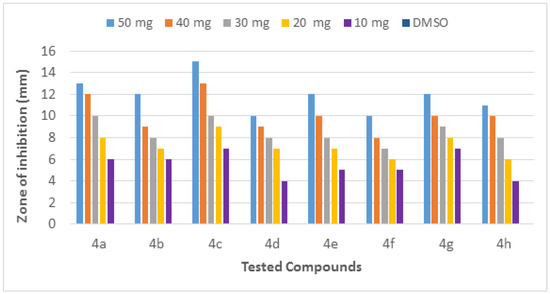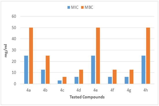 The molecules (4a–h) were screened for antibacterial activity at five concentrations (10, 20, 30, 40, and 50 mg/well) against ESBL-producing E. coli by agar well diffusion. Broth dilution methods calculated MIC and MBC. The results are presented in Table 2 and Figure 2 and Figure 3 regarding the activity. The zone of inhibition (mm) increases as the concentration of compounds increases. Compounds 4a and 4c showed the highest zone of inhibition (13 ± 2 and 15 ± 2, respectively) at 50 mg concentration of compound as compared to other compounds. All other compounds also showed good activity. The MIC and MBC of the tested molecules were calculated (Table 3 and Figure 4 and Figure 5).