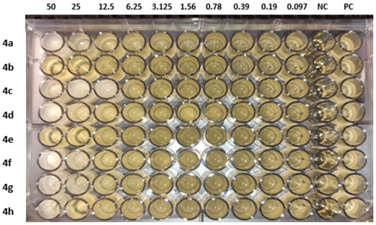 MIC of compounds (4a–h) against ESBL-producing E. coli ST131. NC: negative control and PC: positive control.