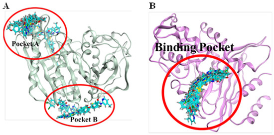 Binding pockets of two target receptors, 6N6K and 7BDS. (A): 6N6K represents two binding pockets (pocket A and pocket B). Based on the consensus of confirmations, pocket A was selected for protein-ligand interaction analysis. (B): 7BDS demonstrates only one binding region as all of the confirmations of chemical compounds bind in similar regions.