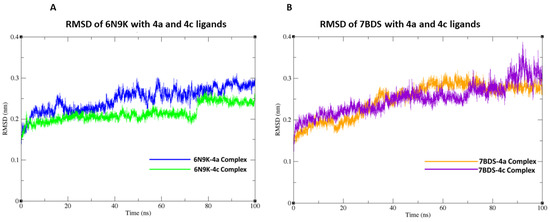 Root-Mean-Square Deviation (RMSD) graph of protein backbone with ligands at 100 ns simulation. (A) RMSD plot of 6N9K with 4a and 4c ligands. (B) RMSD plot of 7BDS with 4a and 4c ligands.