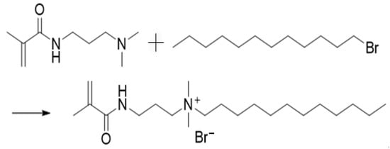 N-(3-dimethylaminopropyl) methylacrylamide (DMAPMA) (8 g, 0.04 mol), bromo-dodecane (12 g, 0.05 mol), and anhydrous acetone (35 mL) were taken in a three-way flask. All the reagents were added in an atmosphere of nitrogen. The mixture in the flask was heated using an oil bath and the solution was refluxed at 50 °C for 30 h. Following the completion of the reaction, the reaction mixture was evaporated using a rotary evaporator to obtain a light-yellow liquid. The obtained product was washed repeatedly with anhydrous ether to obtain a white precipitate. The precipitate was vacuum-dried at room temperature to obtain CHM. The synthetic route is shown in Figure 3.