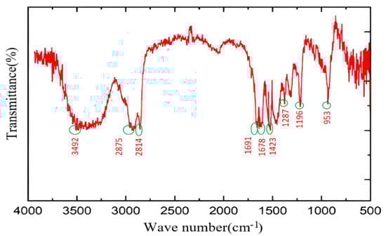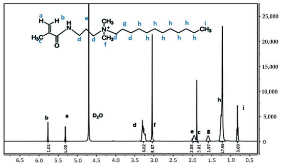 The hydrophobic monomer was characterized using the Fourier transform infrared (FTIR) and nuclear magnetic resonance (NMR) spectroscopy techniques, and the results are shown in Figure 4 and Figure 5. The FTIR profiles recorded for CHM reveals the presence of a peak at 3492 cm−1, which can be attributed to N-H stretching. The peaks at 2875 and 2814 cm−1 represent the antisymmetric stretching and symmetric stretching vibrations of C-H. The peak at 1691 cm−1 represents the stretching of the olefinic double bond (C=C unit), the peak at 1678 cm−1 is attributed to the stretching vibration of the C=O (carboxyl) group, the peak at 1423 cm−1 reflects the presence of the N+ unit in the saturated C-H plane curved vibration region, the peaks at 1287 and 1196 cm−1 correspond to the telescopic vibration of the C-N and C-C units, respectively, and the peak at 953 cm−1 indicates the presence of the double substituted olefin unit. The NMR spectra recorded for the CHM unit were analyzed (i: 0.80–0.86 [t, 3H, CH3-CH2], h: 1.15–1.32 [d, 18H, CH2-(CH2)9-CH3], g: 1.50–1.62 [s, 2H, N-CH2-CH2-CH2], c: 1.86–1.92 [s, 3H, CH3-C(=CH2)(C=O)], e: 1.9–2.0 [s, 2H, N-CH2-CH2-CH2-N], f: 3.02–3.10 [s, 6H, CH3-N-CH3], d: 3.20–3.35 [m, 6H, CH2-N], a: 5.30–5.35 [s, 1H, H-C=C-CH3], b: 5.75–5.80 [s, 1H, H-C=C-C=O]. The presence of the characteristic peaks indicates the successful synthesis of the designed and targeted functional monomer.