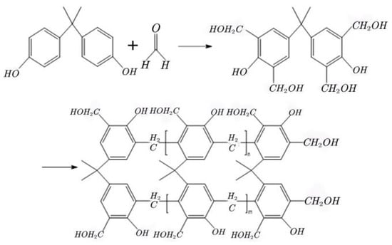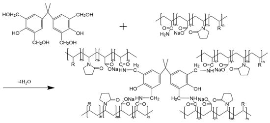 A certain amount of bisphenol A, the catalyst (6% sodium hydroxide solution), and a formaldehyde solution were added to a four-way flask equipped with a thermometer and a stirrer. The flask was mounted on a reflux device and attached to a constant-pressure liquid separation funnel. The mixture was heated and stirred to form a homogenous solution. Following this, the remaining catalyst was added to the mixture, the pH value of the solution was adjusted, and the temperature was allowed to rise. The reaction mixture was stirred and the crosslinker was obtained after cooling the reaction mixture following the completion of the reaction (Figure 7).