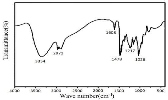 Figure 8 presents the infrared spectral profile recorded for the phenolic resin-based crosslinker. The peak at 3354 cm−1 represents the stretching vibration of the intermolecular hydrogen bond, the peak at 2971 cm−1 can be attributed to the telescopic vibration of the -CH2− unit, the peak at 1608 cm−1 is the skeleton vibration of the C=C unit in the benzene ring, the peak at 1478 cm−1 presents the skeleton stretching vibration of the benzene ring, and the peaks at 1217 and 1026 cm−1 correspond to the C-O stretching vibration of the CO unit in the hydroxymethyl group. The data reveal the successful synthesis of the phenolic resin-based crosslinking agent.