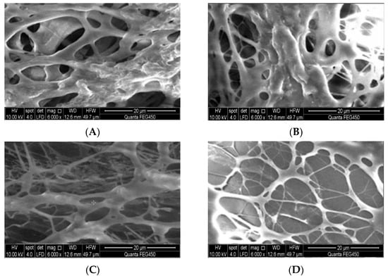 Gel microstructure recorded under conditions of different aging times. (A) Gel aging for 5 days; (B) Gel aging for 30 days; (C) Gel aging for 60 days;(D) Gel aging for 90 days.