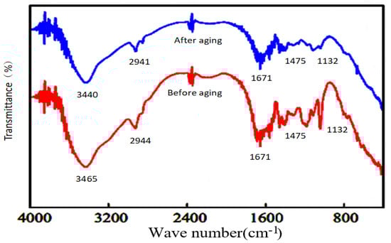 The FTIR spectral profiles were recorded for the weak gel before and after aging (Figure 12). The peak positions changed significantly before and after aging. For example, the peak at 3448 cm−1 shifted to 3423 cm−1 after aging. The hydrolysis of the amide group (resulting in the formation of a carboxylic acid group) in the hydrophobic associative polymer resulted in the strengthening of the hydrogen bond. This resulted in a shift in the peak position towards the low wavenumber region. Analysis of the IR profile revealed that the hydrophobic associative polymer undergoes open-chain thermal degradation of the amide group. However, the microstructure of weak gels did not change significantly following high-temperature aging, indicating that the chain opening process associated with the hydrophobic associative polymer is not the primary thermal degradation mode that results in the destruction of the structure of the weak gel network. Hydrophobic associative polymer molecules undergo thermal degradation (polymerization or random fracture occurs), but the degree of degradation is relatively small. The five-member ring structure of NVP can effectively increase the steric hindrance, improve the rigidity of the molecular chain, inhibit the process of hydrolysis of amide groups to a certain extent, improve the thermal stability of the polymer backbone, and weaken the strength of the adverse effects generated under conditions of thermal degradation. The results revealed that the hydrophobic associative polymer gel system prepared using reinjection water retained its stability after long-term high-temperature aging. The rigidity of the three-dimensional network structure formed by the hydrophobic associative polymer and phenolic resin-based crosslinker can suppress the process of polymer chain curling (occurring under saline conditions) to a certain extent. The gel does not undergo dehydration shrinkage.