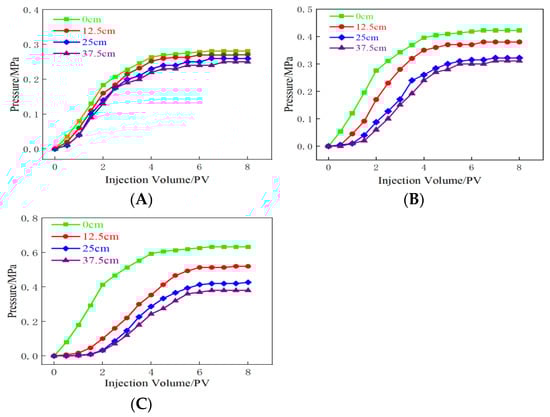 Figure 13 presents the pressure curve recorded for the hydrophobic associative polymer gel system. The variation in the curve with changes in the injection amount was recorded under conditions of varying permeability. The sand-filling tube with high permeability was used for the experiments. Each pressure measuring point started up steadily, and stability was attained after 3 PV injections (Figure 13A). The pressure at the points that were 0 and 12.5 cm away from the injection point increased rapidly with a decrease in permeability. The rate of increase at these points was higher than the rate of increase in pressure recorded at the points that were 25 and 37.5 cm away from the injection point. The pressure at each measuring point became stable after the pressure successively started (Figure 13B). Figure 13C was 100 × 10−3 μm2. The pressure rises rapidly at the injection end, and an increase in the amount of injection volume results in an increase in pressure at the measuring point. It was observed that the pressure at each measuring point increased steadily when the sand-filled pipes characterized by varying degrees of permeability were used for the experiments. The hydrophobic associative polymer gel could be effectively injected into the system.