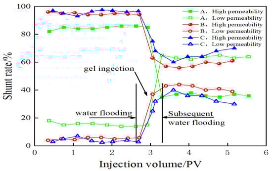 Different permeability levels were tested by conducting a double-tube parallel experiment when the reinjection salinity was 40,300.86 mg/L, and the temperature was 120 °C. Water flooding was achieved, and 0.3 PV of the polymer gel was injected into the system. The gel was aged for 5–7 days, and the instantaneous flow rate of the high- and low- permeability layers was recorded under conditions of water flooding. The objective was to determine whether the hydrophobic associative polymer gel could effectively plug heterogeneous layers while maintaining good flow characteristics. The rates before and after plugging under conditions of varying degrees of permeability were recorded (Table 3). The results revealed that fluids shifted from the hyperpermeability layer to the hypopermeability layer, resulting in a decrease in the hygroscopic layer and an increase in the hygroscopic layer when the gel was injected into the parallel core. A decrease in the core permeability resulted in a significant increase in the hygroscopic layer. These findings suggest that a gel profile control system can be adopted for the strata with strong heterogeneity to effectively plug the high-permeability layer [23,24,25].
