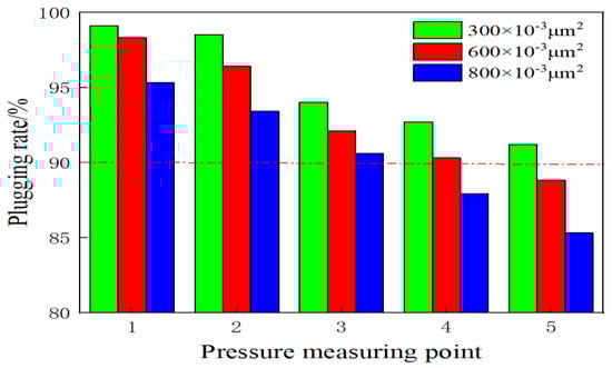 Figure 15 presents the change in the plugging rate observed at each measuring point in the sand-filled pipe that exhibits varying permeability characteristics following the formation of the gel from the weak gel. The plugging rate at each measuring point was analyzed, and it was observed that the plugging rate gradually decreased as the measuring point moved away from measuring point 1. An increase in permeability resulted in the deterioration in the plugging conditions, and the conditions were poorer than the conditions recorded at the same pressure point. For instance, the plugging rate at each measuring point was >90% when the permeability was 371 × 10−3 μm2. Similarly, the plugging rate at measuring point 5 was 88.8% at a permeability of 680 × 10−3 μm2. The plugging rates at the pressure measuring points 4 and 5 were 87.9 and 85.3%, respectively, at a permeability of 805 × 10−3 μm2. The analysis of different permeability levels revealed that each measuring point was successfully and appropriately pressurized. The sealing rate was greater than 85%, suggesting that the gel exhibited excellent plugging performance.