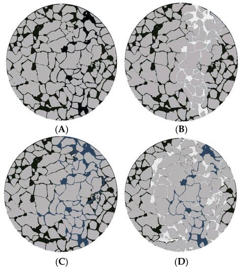 Schematic representation of the oil displacement effect produced by the microsimulation glass etching model. (A) Initial; (B) Water flooding; (C) Gel injection;(D) Subsequent water flooding.