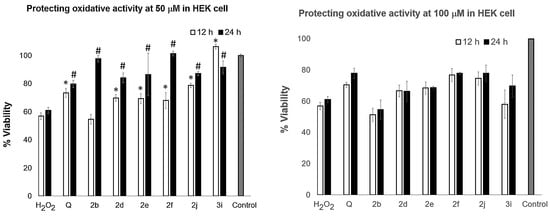 Protective effect of synthesized compounds on H2O2-induced cytotoxicity in cultured HEK cells (means ± SD, n = 3). Data (cell viability, measured by the MTT assay) were expressed as a percentage of the control group, which is 100%. The results were calculated from three independent experiments and are shown as mean ± SD. Compared to the H2O2 model group, the p values were calculated using a one-way ANOVA with Tukey (Turkey HSD) multiple comparison analysis; * p < 0.05 at 12 h treatment, # p < 0.05 at 24 h treatment.
