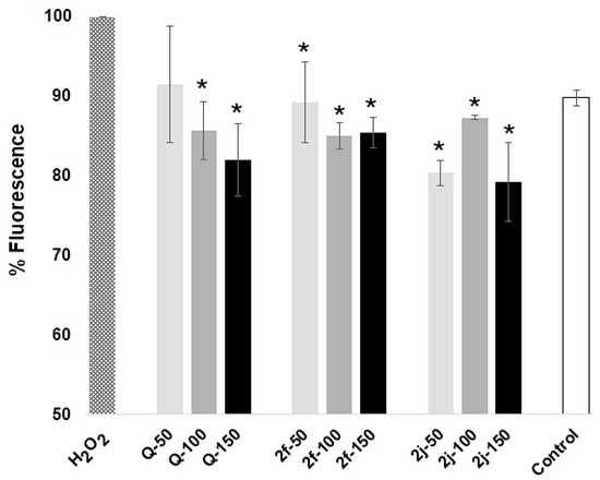 ROS is the main contributor to cell death. These reactive molecules are formed by several mechanisms and can be detected by various techniques. In order to investigate the level of cellular ROS after treatment with compounds, the accumulation of intracellular ROS in cells was quantified with a cellular ROS assay kit (ab186029, Abcam, Boston, USA) fluorescence assay. After pretreatment with 2f, 2j, and 3i at 50, 100, and 150 μM for 24 h, cell stress was induced with 5 mM hydrogen peroxide for 30 min. The cells in each well were collected and resuspended with a serum-free medium containing the ROS red probe. Subsequently, cells were incubated at 37 °C for 30 min in the dark, and fluorescence was read at Ex/Em = 650/675 nm. The fluorescence intensity of the cell after preincubation with 2f and 2j at 50, 100, and 150 μM was significantly reduced compared to the H2O2-treated cells (Figure 4). The fluorescence decreased significantly after pretreatment with 2f, 2j, and 3i, and most of the fluorescence changes were among those with concentrations of 150 μM. Overall, these results suggested that pretreatment with 2f and 2j could reduce oxidative stress.