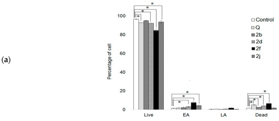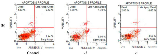 Cells were treated with control (medium) and samples with IC50: quercetin, 2b, 2d, 2f, and 2j. The bars represent the ratios of the apoptotic cells in each group. Data from each cell cycle phase are expressed as means ± SD deviation of three independent experiments. * p < 0.05 vs. control group for each phase. The p values were calculated using a one-way ANOVA with Tukey’s HSD multiple comparison post hoc analysis (a). The apoptotic effect of synthesized compounds, 2f and 2j, incubated for 24 h in HeLa cells (b).