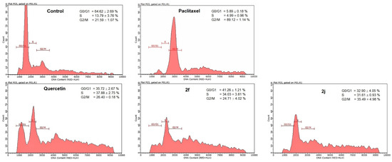 Flow cytometry analysis of cell cycle. Representative flow cytometry histograms of the percentage of cells in G0/G1, S, and G2/M phases of the cell cycle in HeLa cells. Cells treated with 2f, 2j, quercetin with concentration at IC50, paclitaxel (5 μM), or untreated control for 24 h. Control and treated cells were fixed, stained, and analyzed by flow cytometry as per the Muse® cell cycle kit protocol.