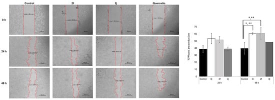 Cell migration in 2f and 2j compared to the untreated control were examined for 24 and 48 h. Quercetin was also investigated. In HEK293 cells, the migration of treated cells by 2f, 2j, and quercetin showed significant induction of cell migration compared to the untreated (Figure 7).