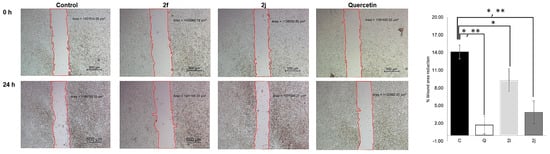 A scratch assay was performed to examine the migration ability of synthesized compounds 2f and 2j at 100 μM compared with untreated control. Representative pictures of the assay induce the migration of HeLa cells using quercetin as a reference. Pictures were taken at the start of the experiment (0 h) and 24 h later. Pictures of representative experiments are shown, and the means ± SD are illustrated in the graphs (n = 3; *: p < 0.05 and **: p < 0.001, Turkey HSD). Scale bars represent 500 μm.