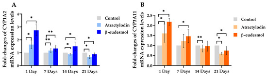 Figure 1. Fold-changes of mCYP1A2 and mCYP3A11 mRNA expression levels in mouse livers. The mRNA expressions of mCYP1A2 (A) and mCYP3A11 (B) in mouse livers were investigated in male ICR mice following a daily oral dose of 100 mg/kg body weight of atractylodin or β-eudesmol for 1, 7, 14, and 21 days. Control mice were fed with distilled water. Data are expressed as median (95% CI) from three experiments (duplicate each). Asterisks indicate significant differences from the control. Statistical significance with * p = 0.002, ** p = 0.04 compared with control.