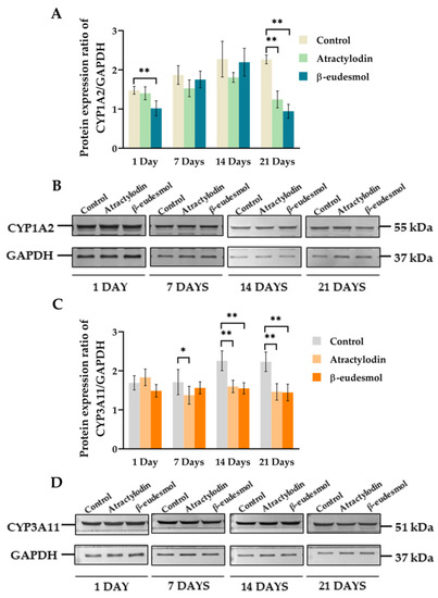 Figure 2. Protein expression ratio and western immunoblots analyses of mCYP1A2 and mCYP3A11 in mouse livers. The protein expression ratio and analysis of western immunoblots of mCYP1A2 (A,B) and mCYP3A11 (C,D) were investigated in the polled livers of three male ICR mice following a daily oral dose of 100 mg/kg body weight of atractylodin, or β-eudesmol for 1, 7, 14, and 21 days. Control mice were fed with distilled water. Data are expressed as median (95% CI) from six replications. Asterisks indicate significant differences from the control. Statistical significance with * p = 0.039, ** p = 0.004 compared with control.