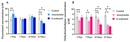 Phenacetin and nifedipine are substrates of CYP1A2 and CYP3A11, respectively. Both substrates are converted via the CYP enzyme to paracetamol and dehydronefedipine, respectively. The concentrations of paracetamol and dehydronefedipine were used to determine the activities of mCYP1A2 and mCYP3A11. The effects of atractylodin and β-eudesmol on mCYP1A2 and mCYP3A11 activities were, respectively, determined by measuring paracetamol (mCYP1A2-dependent metabolite) and dehydronifiedipine (mCYP3A11-dependent metabolite) concentrations. Figure 3A,B and Table S3 show paracetamol and dehydronifiedipine concentrations in the liver microsomes of mice receiving oral atractylodin or β-eudesmol at a daily dose of 100 mg/kg body weight for 1, 7, 14, and 21 days compared with the control group.