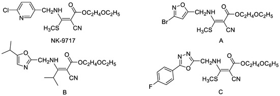 In recent years, 2-cyanoacrylatesplay a vital role in pesticidal and medicinal fields. Many 2-cyanoacrylate-based compounds have attracted intense attention for different bioactivities containing insecticidal [1,2], herbicidal [3,4,5], fungicidal [6], plant growth regulatory [7], and antitumor activity [8]. For example, NK-9717 (Figure 1), a potent herbicide owning 2-cyanoacrylate moiety, displayed wonderful herbicidal properties against some weeds such as Brassica campestris and Amaranthus retroflexus [9]. Recently, Wang et al. reported that isoxazole-containing 2-cyanoacrylate compound A (Figure 1) had significant herbicidal activity [10], Zhao et al. obtained 2-cyanoacrylate compound B (Figure 1) with a substituted oxazole moiety possessing interesting plant growth regulatory effect in addition to excellent herbicidal activity [11]. More recently, Shi and co-workers found that 1,3,4-oxadiazole-containing 2-cyanoacrylate analogue C (Figure 1) exhibited vital antitumor properties against human hepatoma cells [12]. This strongly promoted the research of bioactive molecules containing the 2-cyanoacrylate subunit.