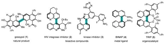 In view of their unique properties, atropisomers have received much attention from researchers in all sub-fields of chemistry (Figure 1) [7,8,9]. They are present in natural products [10,11], such as gossypol (1) [12], and bioactive compounds [13,14,15,16,17], such as HIV integrase inhibitor (2) [18] and kinase inhibitor (3) [19], but they also find applications as metal ligands, such as BINAP (4) [20], organocatalysts, such as chiral phosphoric acid (5) [21], in polymer science [22,23], etc.
