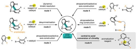 - Route 4: Atropoenantioselective construction of the stereogenic axis using a chiral catalyst [41,42,43].