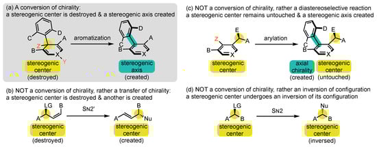 - Conversions of chirality are also referred to in the literature by several other denominations, which all appear to us as less suited. Transfer has long been the most frequently used term [53,54,55], but it brings the idea of relocation rather than transformation. For us, it should be restricted to reactions where the stereogenic element that is destroyed and the one that is created are of the same nature, such as in SN2′ reactions with allylic leaving groups (Scheme 2b) [56]. Exchange [49,57] and interconversion [47] can also be encountered, but they evoke the idea of reversibility, which is generally not the case in those transformations.