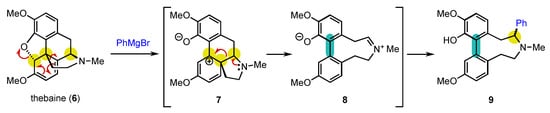From an historical point of view, it is quite amusing to realize that the first central-to-axial conversion of chirality was achieved in 1905 by Freund, even before the description of axial chirality, during reactivity studies on the natural product thebaine (6) (Scheme 3) [65]. Of course, it could not be identified at that moment, and it took almost half a century before the real explanation of what happened could be given by Robinson and Berson [66,67,68]. Treatment of 6 with phenylmagnesium bromide resulted in a complex rearrangement with aromatization to deliver biaryl atropisomer 9 as a mixture of two diastereomers. The reaction proceeds through the opening of the oxa-bridge with rearrangement of the carbon skeleton to afford 7, which can aromatize to 8. At this stage, the three initially present stereogenic centers have been destroyed with the concomitant installation of the stereogenic axis. The reaction terminates with trapping of the iminium ion by the Grignard reagent, giving rise to the formation of 9 as two diastereomers, which complicated the understanding of the transformation.