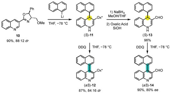 Berson’s hypotheses were first confirmed by the explicitly designed central-to-axial conversion of chirality during aromatization proposed by the group of Meyers in 1984 (Scheme 5) [53]. Chiral oxazoline containing quinoline 10 underwent an efficient dearomatization by addition of naphthyllithium to obtain the corresponding dihydropyridine (S)-11 with a diastereomeric ratio of 88:12. The sequence went on with an oxidative rearomatization with DDQ, yielding 4-arylquinoline atropisomer (aS)-12 with a 84:16 dr, indicating a conversion percentage of 90%. In order to confirm that the enantioselectivity was not induced by the chiral oxazoline, it was deprotected to afford aldehyde (S)-13, which was oxidized in the same condition to obtain the pyridine (aS)-14 with an enantiomeric excess of 80%. Those experiments brought the first definitive evidence that central-to-axial conversion of chirality can be an efficient strategy for the preparation of enantioenriched atropisomers.