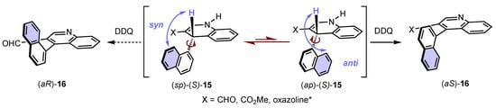 In this seminal work, Meyers also proposed a stereochemical model inspired by Curtin–Hamett principle, which can be applied to all examples that will be discussed in this review [53]. 1,4-Dihydropyridines (DHP) adopt very flat boat conformations [72], with the bulkiest substituent at position 4 on pseudo-axial position to escape gauche interactions with adjacent substituents. On the basis of analyses of the 1,4-dihydroquinoline (S)-15 by X-ray diffraction and NMR, two stable conformers with a rotation barrier below 75 kJ·mol-1 could be identified, allowing for a rapid interconversion at room temperature. One conformer is the anti-periplanar (ap)-(S)-15 in which the non-connective benzene of the napthyl group is below the 1,4-dihydroquinoline core and anti to the hydrogen atom, and the other one is the syn-periplanar (sp)-(S)-15 in which this benzene unit points towards to the hydrogen atom (Scheme 6). Despite the fact that the (sp)-(S)-15 conformation is more stable [73], the configuration of the final product (aS)-16 indicated that the (ap)-(S)-15 anti-periplanar conformation, with the bulky group as far as possible from the hydride to be abstracted, was reacting. This result could be explained by the less important hindrance around the abstracted hydride in this conformation.