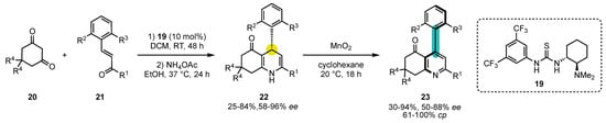 A strong limitation for the implementation of oxidative aromatization with central-to-axial conversion of chirality has long been the preparation of enantioenriched substrates. The key to force this lock was the strategy introduced by Bressy, Bugaut, and Rodriguez in 2016, which combined the organocatalyzed enantioselective synthesis of non-aromatic heterocycles with oxidative aromatization with central-to-axial conversion of chirality [64]. This first example consisted of an enantioselective pyridine Hantzsch synthesis (Scheme 8). Takemoto thiourea catalyst 19 was used to perform the enantioselective Michael addition between cyclic 1,3-diketones 20 and highly congested enones 21, followed by cyclodehydration in the presence of NH4OAc to afford the 4-aryl-1,4-dihydropyridines 22 with good to excellent yields and enantiomeric excesses. Screening of numerous oxidants revealed that only MnO2 was efficient at converting the stereochemical information. Cyclohexane was selected as the best solvent to perform the oxidation, and the corresponding 4-arylpyridine atropisomers 23 were obtained with good to excellent ee and cp. The difficulties in finding an oxidant that delivers high stereospecificities can be ascribed to the fact that 23 possesses one ortho substituent on the pyridine ring and two on the other ring, whereas it is the opposite for other systems presented previously.