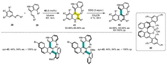 On the basis of this seminal report of Bressy, Bugaut, and Rodriguez on the combination of organocatalysis and conversion of chirality [64], the group of Bertuzzi and Corti described the two-step synthesis of chiral indole–quinoline systems (Scheme 12) [125]. The first step consisted of a Povarov reaction between N-arylimines 38 and 3-alkenylindoles 39 catalyzed by the chiral phosphoric acid 40 to obtain 1,2,3,4-tetrahydroquinolines 41, which were then oxidized to the corresponding atropisomeric quinolines 42 using DDQ as oxidant. Good to excellent yields, ee, and cp were obtained for all examples. In the cases where R4 is a bulky aromatic ring, molecules, such as 43, containing two stereogenic axes, were obtained as separable diastereomers, with good enantioselectivities for both of them.