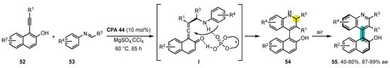In 2022, the group of Zhou designed an elegant alternative approach for the preparation of atropoisomeric 4-naphthylquinolines by chiral phosphoric acid (CPA) catalyzed asymmetric intramolecular cycloaddition of in situ formed vinylidene–quinone methines (VQM) from alkynylnaphthols 52 and isolated or one-pot-generated imines 53 (Scheme 14) [129]. A dual hydrogen-bonding activation by the catalyst 44 was proposed, allowing for a subsequent [2+4]-cycloaddition of VQM I to 54 and final auto-oxidation under air to build the desired atropoisomers 55 in moderate to good yields and high enantioselectivities (up to 99% ee).