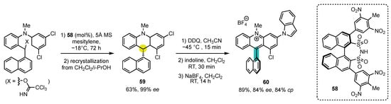 Recently, the same group disclosed an enantioselective synthesis of enantioenriched the 9-arylacridinium 60 combining enantioselective organocatalysis and central-to-axial conversion of chirality (Scheme 16) [131]. The reaction sequence consists of a 6π electrocyclization catalyzed by disulfonimide 58, followed by in situ oxidation with DDQ. For two examples (one of them presented in Scheme 15), the non-aromatic intermediate 59 was isolated and recrystallized, which allowed evaluating the efficiency of the conversion of chirality. The sequence could even be completed by a regioselective nucleophilic aromatic substitution of one of the chlorine atoms.